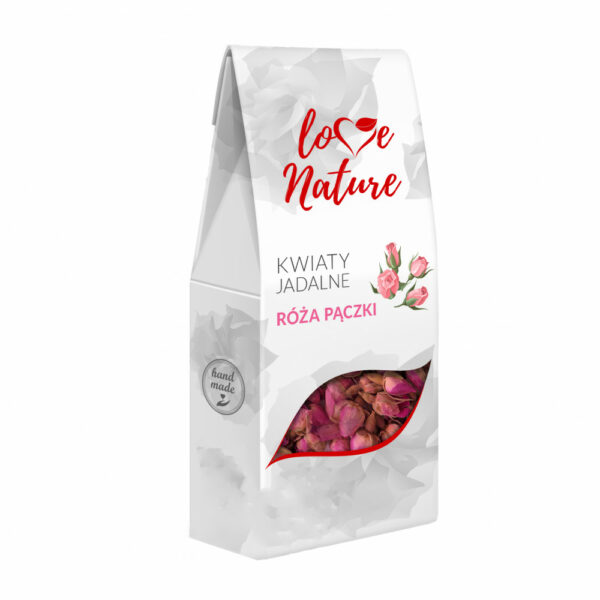 Jadalne kwiaty firmy Love Nature to piękna, a zarazem naturalna dekoracja, która stanowi must-have w każdej kuchni. Zawierają szereg witamin, soli mineralnych, są źródłem flawonoidów, które w organizmie człowieka działają jak antyoksydanty.Suszone pączki róży to niezastąpiona dekoracja w każdej cukierni i domowej kuchni. Mają charakterystyczny, piękny zapach i intensywny kolor, dzięki temu mogą być wykorzystane jako naturalny barwnik. Idealne jako dodatek do ciast, deserów i sałatek oraz jogurtu czy kefiru.Pączki sprawdzają się także jako dodatek do herbat i mieszanek owocowych, zapewniając wspaniały zapach i składniki odżywcze.Kraj pochodzenia: Iran, ChinySkład: pączki róży 100%