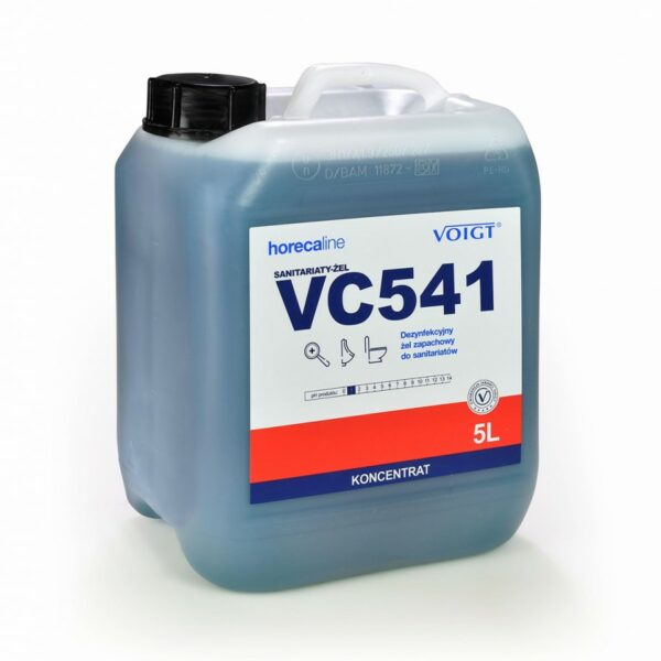 VC541 to produkt o właściwościach dezynfekcyjnych i spektrum działania bakterio- i grzybobójczym. Przeznaczony do mycia powierzchni, pomieszczeń i urządzeń sanitarnych takich jak muszle klozetowe, pisuary, bidety oraz kafelki, umywalki, toalety i prysznice. Dzięki zwiększonej lepkości charakteryzuje się dłuższym czasem działania gdyż wolniej spływa z pionowych i skośnych powierzchni. Skutecznie usuwa rdzę, kamień wodny, tłusty brud, osady wapienne i mydlane. Nadaje lśniący połysk czyszczonym powierzchniom. Odpowiedni do stosowania w miejscach prywatnych, publicznych i w przemyśle. Można go również stosować do powierzchni mających kontakt z żywnością.Posiada pozwolenie NR: 4647/11. Przeznaczony do powszechnego użytku.Właściwości preparatu VC-541:zapobiega powstawaniu pleśni w miejscach zawilgoconychskutecznie usuwa tłusty brud, osady wapienne i mydlane, a także rdzę i kamień wodnypozostawia świeży zapach w pomieszczeniuodpowiedni do powierzchni mających kontakt z żywnościąnadaje lśniący połysk mytym powierzchniomSposób użycia:W celu dezynfekcji powierzchni pokryć preparatem dezynfekowane miejsce i pozostawić na odpowiedni czas, a następnie spłukać wodą. Powierzchnie mające kontakt z żywnością należy spłukać wodą jakości wody pitnej. Zdezynfekowane powierzchnie mogą być użytkowane bezpośrednio po procesie dezynfekcji. Pomieszczenia, w których dokonywano dezynfekcji powierzchni nie wymagają wentylacji.Działanie bakteriobójcze: czas działania: 5 minut, stężenie: 100%Działanie grzybobójcze: czas działania: 15 minut, stężenie: 100%Specyfikacja: Postać: niebieski żel, pH 1,5Magazynowanie i utylizacjaPrzechowywać w temperaturze nie przekraczającej 40 °C. Unikać źródeł ciepła, promieniowania i elektrostatyki. Przechowywać z dala od środków spożywczych. Przechowywać z dala od dzieci.Instrukcje bezpieczeństwa dla użytkownikaZawsze, przed pierwszym zastosowaniem produktu, należy zapoznać się z treścią Karty Charakterystyki oraz ulotki technicznej produktu. Przed każdym użyciem należy przeczytać etykietę i informacje dotyczące produktu. Chronić przed dziećmi.W razie dostania się do dróg oddechowych: zapewnić dopływ świeżego powietrza. W przypadku nie ustąpienia objawów, wezwać pomoc medyczną. Kontakt ze skórą: zdjąć zanieczyszczoną odzież, skórę zmyć natychmiast dużą ilością wody. Kontakt z oczami: płukać przez kilka minut pod bieżącą wodą przy otwartych powiekach, nałożyć jałowy opatrunek, skontaktować się z lekarzem. Drogą pokarmową: popić dużą ilością wody, nie wywoływać wymiotów, natychmiast skontaktować się z lekarzem.Producent: PPUH VOIGT Sp. z o.o. ul. Jordana 90, 41-813 Zabrze, Polska Tel.: +48 322722573, Fax: +48 322723917, info@voigt.pl
