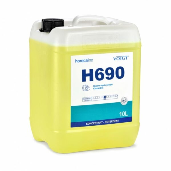 H690 to skoncentrowany płyn do ręcznego mycia naczyń, szkła i akcesoriów produkcyjnych. Dzięki unikalnej recepturze, na mytych powierzchniach nie pozostawia żadnych smug i zacieków, ułatwiając pracę w kuchni. Idealny do mycia talerzy, garnków, patelni, szklanek i kieliszków. Skutecznie usuwa tłuszcz oraz wszelkie inne zabrudzenia. Zawiera specjalne, delikatne związki, działające pielęgnacyjnie na skórę rąk. Nie wpływa negatywnie na żywność.W przypadku wstępnego przemycia naczyń przed włożeniem do zmywarki obficie spłukać naczynia wodą.Właściwości preparatu H690:nie pozostawia zacieków i smugłatwy do spłukaniaskutecznie usuwa tłuszcz i inne zabrudzeniazawiera przyjemne kopozycje zapachoweSposób użycia:Zalecane rozcieńczenie: 1% (dodać 100 ml płynu do 10 l wody). W przypadku silnych zabrudzeń stosować mocniejszy roztwór myjący. Powierzchnie mające kontakt z żywnością obficie spłukać wodą przeznaczoną do spożycia i pozostawić do wyschnięcia lub ewentualnie przetrzeć.Specyfikacja: Postać: cytrynowa ciecz, pH 6,5-7,5Magazynowanie i utylizacjaPrzechowywać w temperaturze nie przekraczającej 40 °C. Unikać źródeł ciepła, promieniowania i elektrostatyki. Przechowywać z dala od środków spożywczych. Przechowywać z dala od dzieci.Instrukcje bezpieczeństwa dla użytkownikaZawsze, przed pierwszym zastosowaniem produktu, należy zapoznać się z treścią Karty Charakterystyki oraz ulotki technicznej produktu. Przed każdym użyciem należy przeczytać etykietę i informacje dotyczące produktu. Chronić przed dziećmi.Producent: PPUH VOIGT Sp. z o.o. ul. Jordana 90, 41-813 Zabrze, Polska Tel.: +48 322722573, Fax: +48 322723917, info@voigt.pl