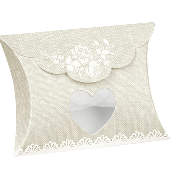 Eleganckie pudełko w formie koperty wykonanej z wysokiej jakości tektury w kolorze beżowym z oryginalnym tłoczeniem i dekoracyjnym nadrukiem w postaci różyczek. Posiada okienko w kształcie serca, doskonale eksponujące wyroby cukiernicze. Idealnie nadaje się do pakowania drobnych cukierków, pralin, trufli i czekoladek.