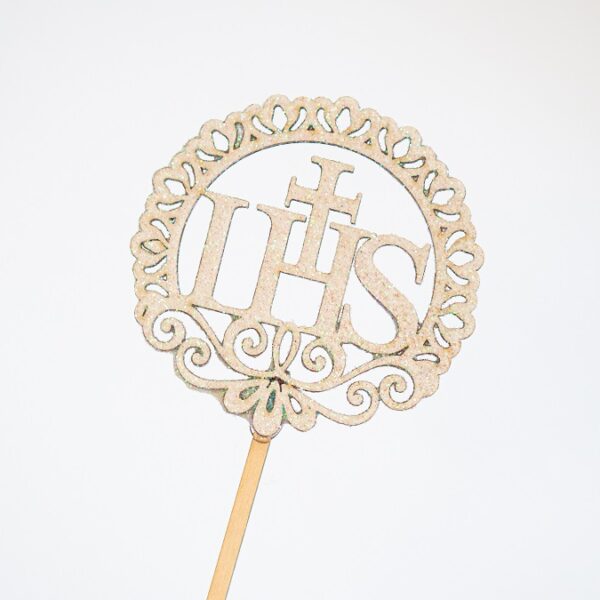 Topper drewniany Komunia IHS okrągły brokatowy srebrny