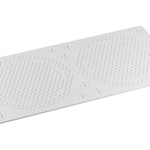 Forma silikonowa posiadająca 2 sześciokątne gniazda z fakturą plastra miodu każde o średnicy 140 mm, wysokości 3,5 mm oraz okrągłego paska z tą samą fakturą o średnicy 40 mm. W formie znajduje się również 10 gniazd w kształcie pszczoły o wymiarach 21x18 mm. Pojemność całkowita formy wynosi 33 ml. Profesjonalne formy włoskiej produkcji są w 100% bezpieczne w kontakcie z żywnością. Mają wszechstronne zastosowanie do produkcji lodów, wyrobów cukierniczych oraz w restauracjach i kawiarniach. Wytrzymałe na temperaturę od -60 °C do + 230 °C.Numer produktu Silikomart: 33.100.87.0065
