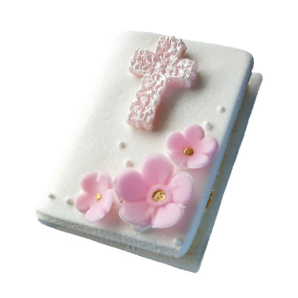 Dekoracja cukrowa leżąca 3D w postaci książeczki komunijnej w kolorze biało-różowym. Nada wyjątkowego wyglądu tortu przygotowanemu z okazji I Komunii Świętej.