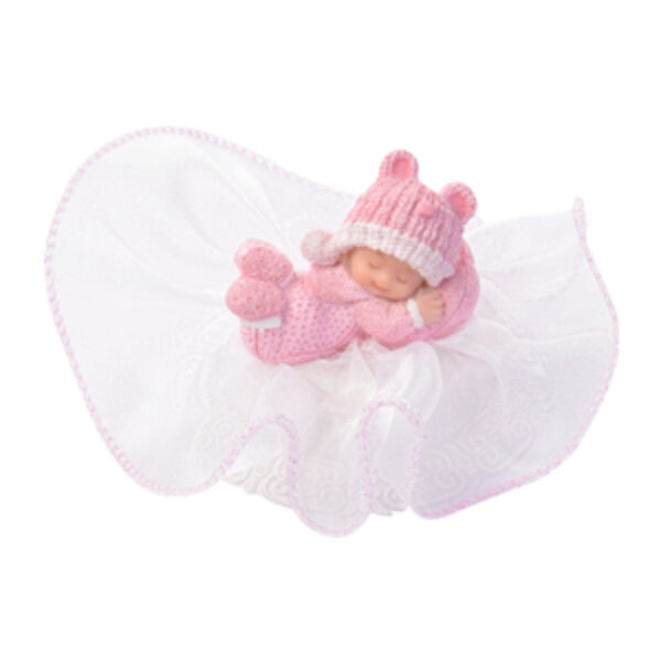 Figurka na tort firmy MODECOR 26008B. Dekoracja plastikowa, idealna ozdoba tortów i ciast z okazji narodzin dziecka, chrztu oraz innych uroczystości. Figurka przedstawia leżące dziecko na poduszce w różowym ubranku, na tiulowej wstążce.
