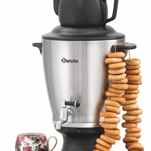 Samowar z dzbankiem do herbaty. Wykonany ze stali nierdzewnej i tworzywa sztucznego. Pojemność 3,2 l. Samowar posiada nienagrzewające się uchwyty oraz ochronę przed przegrzaniem. Funkcja automatycznego wyłączania zasilania i funkcja stałego utrzymywania ciepła.W zestawie gliniany dzbanek, pojemność: 0,8 litra oraz filtr siatkowy do herbaty.Zasilanie:230 VMoc:2 kW