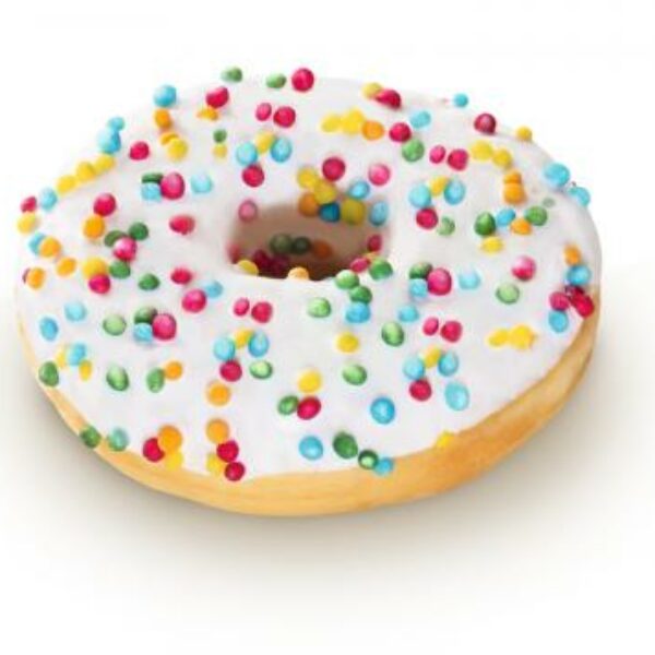 Smażone, głęboko mrożone amerykańskie ciastko drożdżowe w kształcie kółka - z dziurką lub bez. Specjalna receptura produkcji powoduje, że ciastko nie przykleja się do podniebienia, nie obkleja rąk i łatwiej je ugryźć gdyż jest niższe niż inne ciastka lub pączki.Pokryty białą polewą (14,5%) i udekorowany kolorową posypką (7%). Doskonały jako słodka przekąska lub deser. Gotowy do podania po rozmrożeniu.Sposób przygotowania:Wyjąć produkt z opakowania. Rozmrozić w temperaturze pokojowej na około 30 do 60 minut.Nie zamrażać ponownie po rozmrożeniu.Skład: mąka (PSZENNA; ryżowa ; słód PSZENICZNY); oleje i tłuszcze roślinne (palmowy; rzepakowy; kokosowy); woda; cukier; drożdże; dekstroza; słodka serwatka w proszku (MLEKO); odtłuszczone MLEKO w proszku; laktoza (MLEKO); masło kakaowe; SOJOWA; sól; skrobia; substancja spulchniająca (E450; E500); emulgator (E471; stearoilomleczan sodu; lecytyny); substancja glazurująca (E904); naturalny aromat; barwnik (E120; E133; E141i; E160c; E161b).Może zawierać: jaja, migdały, orzechy laskowe.Warunki przechowywania:Trwałość od daty produkcji: 12 miesięcy.Temperatura przechowywania: max. ‐18°C.