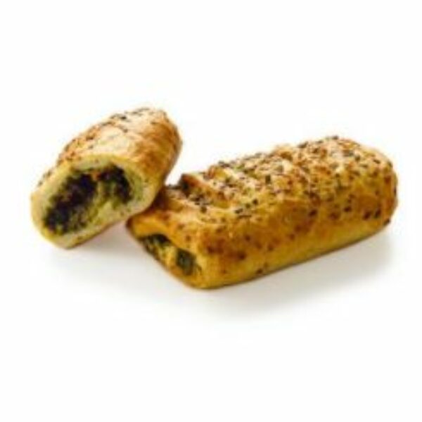 Głęboko mrożone, wygarowane ciasto półfrancuskie w postaci ciastka z wytrawnym nadzieniem (24%) ze szpinakiem i serem feta, udekorowane ziarnami (2,5%). Stanowi idealną przekąskę w ciągu dnia, w pracy, w szkole oraz w trakcie podróży. Produkt odpowiedni dla wegetarian, posiada tzw. czystą etykietę co oznacza, że jego skład pozbawiony jest sztucznych barwników, konserwantów i polepszaczy. Gotowy do wypieku.Sposób przygotowania:Rozmrażanie: 30 min w temperaturze pokojowej. Podgrzać piec do 200°C i wypiekać przekąskę przez ok. 20 +/‐5 minut w temperaturze 180 +/‐10°C. Parametry wypieku zależą od rodzaju posiadanego pieca. Nie zamrażać ponownie po rozmrożeniu.Skład: mąka (PSZENNA; słód PSZENICZNY); woda; szpinak (12,0%); tłuszcze roślinne (palmowy); feta (MLEKO) (4,5%); oleje roslinne (rzepakowy); cukier; drożdże; skrobia; JAJA; sól; siemię lniane brązowe; siemię lniane żółte; nasiona dyni; ZIARNO SEZAMU; nasiona słonecznika; gluten PSZENICZNY; naturalny aromat; czosnek w proszku; przyprawy; emulgator (E471); środek do przetwarzania mąki (kwas askorbinowy); enzymy; drożdże inaktywowane.Może zawierać: orzechy pekan, soję, migdały. Warunki przechowywania:Trwałość od daty produkcji: 12 miesięcy.Temperatura przechowywania: max. ‐18°C.
