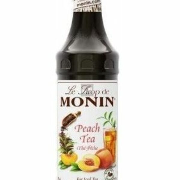 Koncentrat Peach Tea producenta Monin pozwala tworzyć wiele kombinacji napojów herbacianych - od herbaty mrożonej, która jest idealna w upalne dni, aż do wyrafinowanych drinków i koktajli. Można go mieszać z dowolnymi aromatami kwiatów, owoców, orzechów oraz przypraw uzyskując zaskakujący aromat i smak przygotowanego napoju.Dodatkową zaletą syropu jest długotrwała przydatność do spożycia bez konieczności przechowywania go w lodówce oraz wysoka koncentracja, a co za tym idzie - zmniejszenie kosztów przygotowywania napojów.Syrop jest barwy ciemnobrązowej. Ma naturalny smak świeżej brzoskwini, który jest doskonale zrównoważony intensywnym smakiem herbaty z lekką nutką goryczy.Główne jego zastosowanie to lemoniady, koktajle oraz mrożone i ciepłe herbaty.Skład: cukier, woda, zagęszczony sok cytrynowy, ekstrakt herbaty (1g/l rozcieńczony 1:10), zagęszczony sok brzoskwiniowy, naturalny aromat herbaty, naturalny aromat, substancja konserwująca: sorbinian potasu. Odpowiada całkowitej zawartości 42% soku owocowego, w tym 10% soku brzoskwiniowego.Warunki przechowywania:Przed otwarciem przechowywać w temperaturze pokojowej (<25°C).Po otwarciu przechowywać przez 3 miesiące w temperaturze pokojowej, zamknięty w czystym, suchym miejscu.Porada dotycząca rozcieńczania: 1 część syropu na 8 części (wody, koktajlu lub innych płynów)
