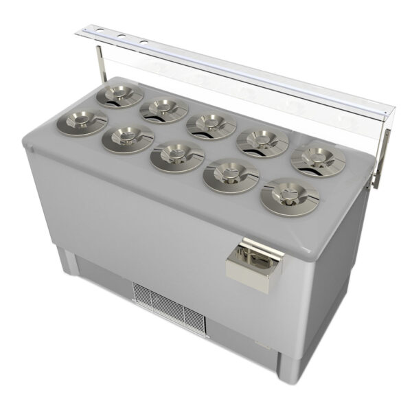 Witryna do lodów w kolorze szarym Pozetti Festival Inox 10 smaków - 2 poziomy oświetlenia LED, osłona plexi. Witryna wykonana została z wysokiej jakości materiałów, posiada klasyczny design przyciągający wzrok klienta.Pozetti Festival Inox charakterystyka:Prosta obsługa za pomocą elektronicznego panelu sterującegoKoła ułatwiające transportOgrzewany kołnierzSzyba pleksi zabezpieczająca przestrzeń serwisowąOświetlenie LED (tylko z szybą pleksi)Chłodzenie statyczne z nawiewemKlasa klimatyczna - 7Kompresor hermetyczny10 miejsc na kuwety (brak kuwet w zestawie)