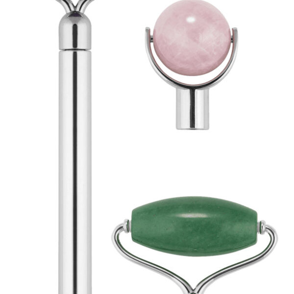 Roller do masażu twarzy z trzema wymiennymi końcówkami. W zestawie trzy naturalne kamienie: ametyst, różowy kwarc i jadeit. Jeden roller i aż trzy, wymienne końc