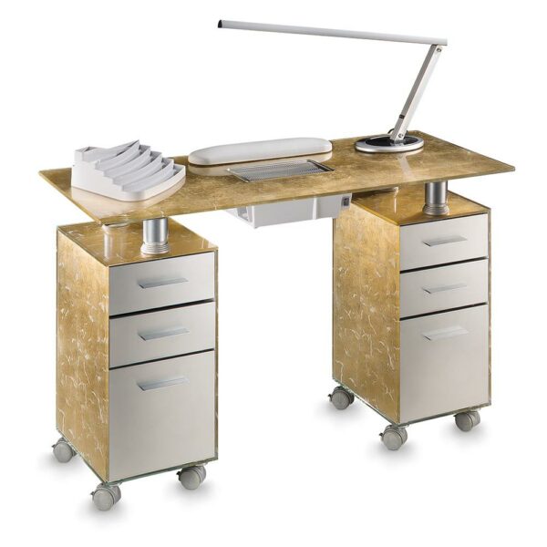 Elegancki stolik do manicure Panda 191 Glass. Blat oraz korpus szafek wykonane są ze szkła hartowanego z motywem złotych liści. Każda szafka z 3 drewnianymi szufladami pokrytymi trawioną stalą, k