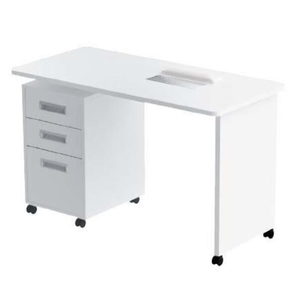 Stolik kosmetyczny do manicure Panda Novo wykonany z płyty laminowanej w białym kolorze. Szafka z trzema szufladami. Wymiary: wysokość: 75 cm szerokość: 130 cm głębokość: 50 cm
