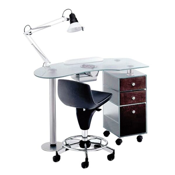 Doskonały do każdego salonu kosmetycznego! Stolik do manicure Panda 185 to stylowy dodatek do każdego salonu kosmetycznego. Zapewnia komfort dla kosmetyczki i klienta. Stolik do manicure Panda 185 prezentuje najnowsze i najlepsze trendy włoskiego designu. Blat oraz korpus szafki wykonane ze szkła nadają stolikowi elegancji. W zestawie znajdują się lampa na biurko i wygodna pufka pod dłoń dla klientki. Stolik dostępny w wersjach z pochłaniaczem pyłu lub bez.