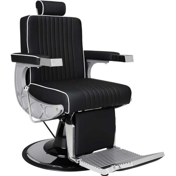 Barberski fotel Ayala Carlos - duża chromowana baza z czarną błyszczącą pompą Barberski fotel Ayala Carlos - duża chromowana baza z czarną błyszczącą pompą. Metalowy, matowy stelaż. Możliwość rozłożenia do pozycji p