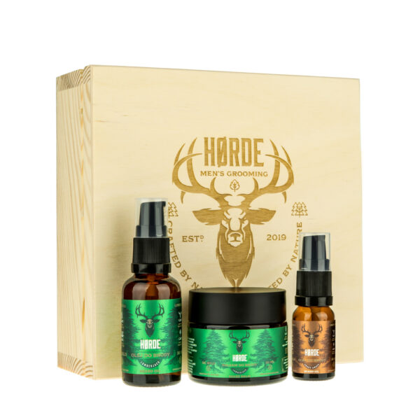 Kosmetyki Horde są stworzone z naturalnych składników. Są bardzo delikatne dla skóry. Nie podrażniają, łagodzą zaczerwienienia i działają przeciwłupieżowo. To idealny prezent dla każdego brodacza. W sosnowej skrzynce znajdują się trzy naturalne kosmetyki do brody, kt