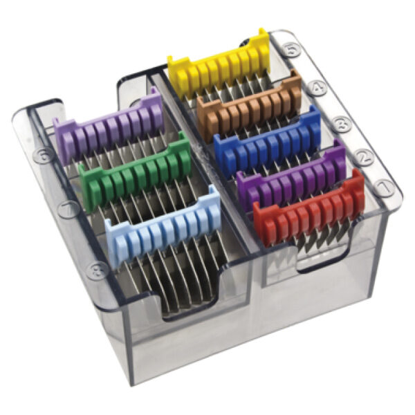 Komplet metalowych nasadek dystansowych do maszynek Wahl, Ermila. Moser, kolorowe, 8 szt.