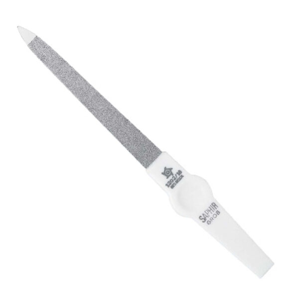Pilnik do paznokci firmy Pfeilring z nasypem szafirowym. rączka z tworzywa sztucznego stalowa powierzchnia pokryta tysiącem drobniutkich cząsteczek szafirowych połączonych niklowym łącznikiem szafirowy nasyp idealnie opiłowuje końc