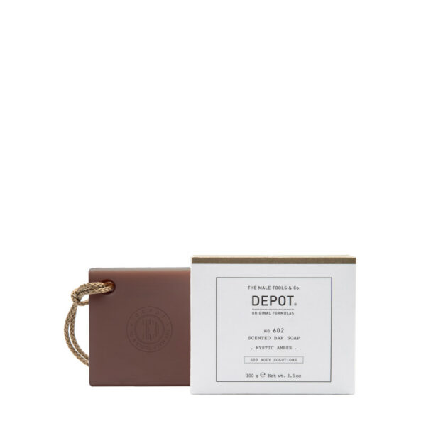 Depot 602 Scented bar soap - mystic amber czyli mydło w kostce do mycia ciała o zapachu bursztynuUrzekające zapachem bursztynu i kwiatów mydło jest bogate w składniki pielęgnujące i odżywiające męską skórę. W przeciwieństwie do wielu mydeł do ciała przyjemnie się pieni - wtedy też pachnie najmocniej. Aby ułatwić korzystanie z mydła producent dodał do niego funkcjonalny sznurek.Cechy charakterystyczne:Kompleks botaniczny, mieszanka 10 ekstraktów roślinnych o niezwykle korzystnym wpływie na skóręErytrytol, środek utrzymujący wilgoć, pomaga zachować miękkość i elastyczność skóryGliceryna, środek utrzymujący wilgoć, utrzymuje prawidłowy poziom nawilżeniaWaga: 100gZapach: Mystic amber with an oriental Chypre, spicy and slightly floral fragrance. Bursztynowy zapach wzbogacony o szyprowe i kwiatowe nuty.Sposób użycia: Do mycia należy delikatnie zwilżyć mydło i spieniać je w rękach lub bezpośrednio na gąbce do mycia.