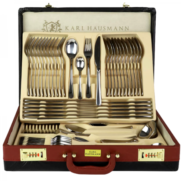 Komplet na sztućce w walizce zawiera 72 elementów. Sztućce Karl Hausmann wyróżniają się wysoką jakością wykonania. Sztućce wykonane zostały z bardzo dobrej jakości stopu chromowo-niklowego, są wytrzymałe i nie ulegają korozji. Wszystkie elementy zestawu zostały wykonane ze stali szlachetnej 18/0. Sztućce sprzedawane są w pięknej i eleganckiej walizce, który ułatwia przechowywanie i zadbanie o sztućce. Walizkę otwiera się poprzez ustawienie trzech zer na zamkach szyfrowych.Komplet zawiera: dwanaście noży stołowych, dwanaście łyżek stołowych, dwanaście widelców stołowych, dwanaście łyżeczek do herbaty, dwanaście widelczyków do ciasta, dwa widelce do mięsa, dwie łyżki do serwowania, widelec do sałatek, łyżeczkę do cukru, łyżeczkę do śmietanki, łyżkę do sałatek, łyżkę wazową, łyżkę do sosów, łopatkę do ciasta, szczypce do cukru.Sztućce można myć w zmywarce, jednak zaleca się myć ręcznie, aby jakość sztućców pozostała na lata.Materiał: Stal nierdzewnaModel: ErisIlość elementów: 72Czyszczenie: Zalecane mycie ręczne, można myć w zmywarce