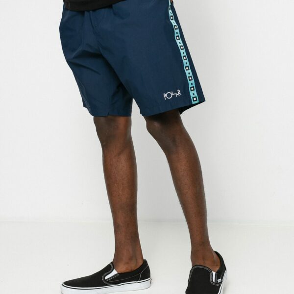 Materiał: 100% Poliamid • Szybkoschnąca tkanina • Po bokach kontrastowe taśmy w paski • Haftowane logo Polar Skate • Elastyczna guma w pasie z regulacją • Luźny krój • Wykonane w Portugalii