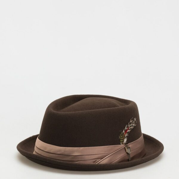 Brixton Stout Pork Pie to elegancki, filcowy kapelusz o krótkim rondzie przyozdobiony satynową opaską, piórami i metalową spinką z grawerowanym logo Brixton • Miękka jedwabna podszewka