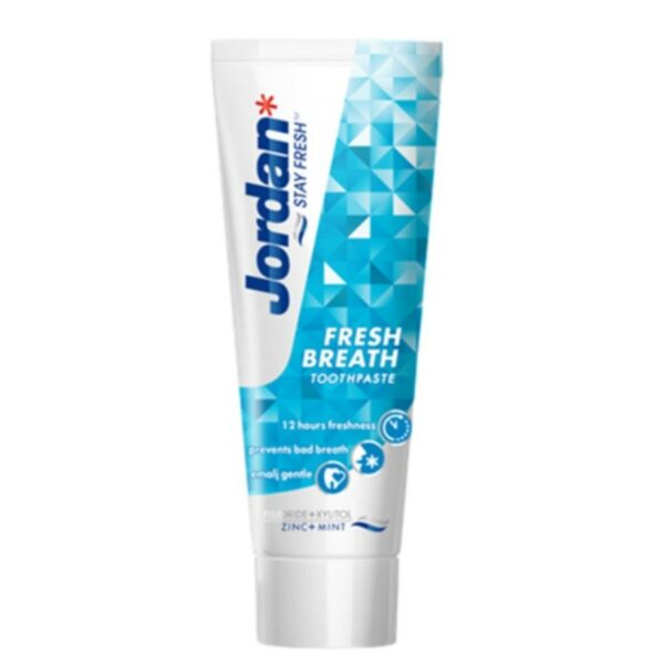 Jordan Fresh Breath Pasta Do Zębów 75ML Jordan Freh Breath to odświeżająca pasta do zębów. Kosmetyk jest gwarancją zdrowej, zadbanej i higienicznie czystej jamy ustnej. Natychmiast pozostawia spektakularne efekty, dzięki którym z pewnością sprosta Twoim oczekiwaniom! Pasta do zębów Jordan Stay Fresh Fresh Breath:delikatnie, lecz skutecznie oczyszcza jamę ustnądzięki technologii Stay Fresh, skutecznie redukuje nieświeży oddechzawiera fluor i ksylitol, dzięki czemu chroni płytkę nazębnąwzmacnia zębycieszy się posiadaniem cynku i mięty – składników gwarantujących świeży oddech, utrzymujący się aż 12 godzinjest kosmetykiem łagodnym dla szkliwa.