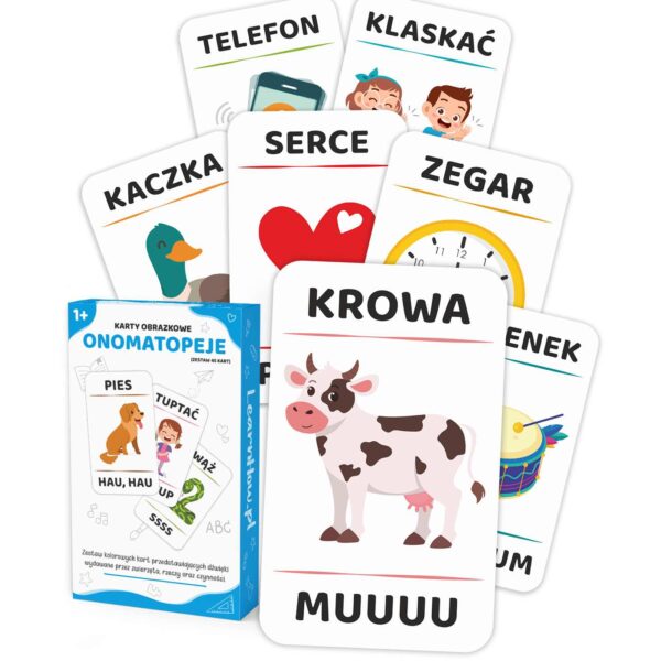 Zestaw 45 kolorowych kart z różnymi wyrazami. Głównym zadaniem dziecka jest czytanie, powtarzanie oraz naśladowanie odgłosów oraz nazw zamieszczonych na kartach. Są to wyrazy dźwiękonaśladowcze wydawane przez zwierzęta, przedmioty oraz podczas różnych czynności. Nazwy oraz wyrazy dźwiękonaśladowcze zapisane dużymi drukowanymi literami - w celu przyjemniejszej oraz łatwiejszej nauki.Zestaw zawiera aż 45 kolorowych kart z nazwami zwierząt, rzeczy oraz czynności, a także związane z nimi wyrazy dźwiękonaśladowcze.Rozwijają umiejętności czytania oraz mówienia – mogą okazać się świetną pomocą, szczególnie na początek takiej nauki!Onomatopeje są to wyrazy dźwiękonaśladowcze, dzięki temu dziecko może łatwiej i chętniej podejść do nauki czytania oraz mówienia.Kolorowe obrazki oraz uśmiechające się zwierzątka na pewno zachęcą dziecko do obserwacji i nauki.Karty obrazkowe mogą również przyczynić się do nauki zwierząt, czynności oraz przedmiotów.Przyjazne dla oka obrazki mogą sprawić, że dziecko wiele chętniej będzie ćwiczyć i rozwijać swoje zdolności.Do kart można wymyślić dziecku zadania lub historyjki - dzięki temu można połączyć naukę z przyjemnością zabawy.Wszystkie karty są w rozmiarze: ~ 11,5 cm x 7 cm, wydrukowane na papierze 200g, a także zalaminowane dzięki czemu zyskują dodatkową trwałość oraz sztywność. W kartach rogi są zaokrąglone - dla jeszcze większej trwałości oraz przyjemności używania.Cechy produktu:Format (~ 11,5 cm x 7 cm).45 kolorowych kart z różnymi wyrazami.Wydrukowany na sztywnym papierze 200g.Karty zalaminowane.Rogi zaokrąglone dla jeszcze większej trwałości.Żywe, przejrzyste kolory.