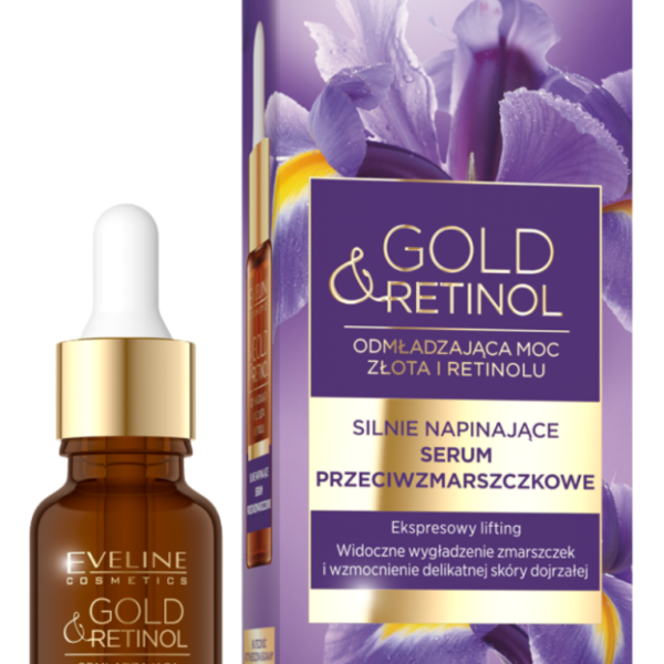 Eveline Gold & Retinol Wygładzające Serum Do Twarzy Przeciwzmarszczkowe 18ML Innowacyjne połączenie retinolu, czystego złota 24K oraz ekstraktu z irysa wspiera naturalne procesy odnowy i samoregeneracji w naskórku, zapewniając wielopoziomowe działanie odmładzające. Starannie dobrane składniki aktywne, ukryte w aksamitnych formułach, doskonale odżywiają, nawilżają i ujędrniają cerę, redukując widoczność nawet najbardziej utrwalonych zmarszczek. Skóra odzyskuje miękkość, zdrowy, równomierny koloryt i naturalny blask.