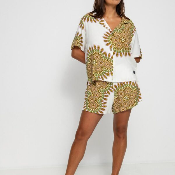 Program sieci artystów RVCA • Kolekcja RVCA x Kelsey Brookes • Tkanina: popelina wiskozowa 100 GSM. • Materiał: 100% wiskoza • Elastyczna guma w pasie • Dwie kieszonki po bokach • Kieszonka z tyłu