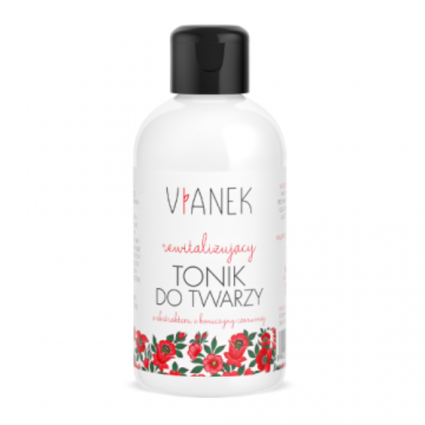 Vianek Rewitalizujący Tonik 150ml Produkt z serii rewitalizującej o właściwościach ujędrniających i przeciwstarzeniowych. Tonik zawiera w swojej formule kwas hialuronowy, który wiąże wodę w naskórku i zapobiega wysuszeniu skóry. Produkt przywraca skórze odpowiednie pH, oczyszcza ją, nawilża, tonizuje. Tonik zawiera ekstrakt z koniczyny czerwonej o silnych właściwościach antyoksydacyjnych. Pojemność: 150mlPrzydatność: 12 miesięcy od daty produkcji, 3 miesiące od momentu otwarcia.Vianek to polska marka kosmetyków naturalnych, dedykowana kobietom w każdym wieku, o zróżnicowanych potrzebach pielęgnacyjnych. Vianek to sześć serii produktów, przeznaczonych do pielęgnacji twarzy, ciała i włosów. Motyw kwiatowy, który pojawia się na opakowaniach kosmetyków stanowi tradycję, przekazywaną z pokolenia na pokolenie w małopolskiej wsi Zalipie.