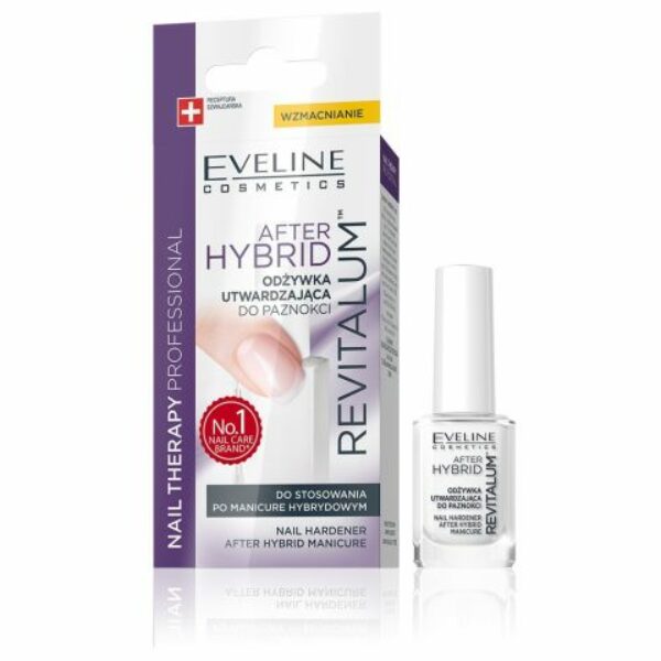 Eveline Nail Therapy Revitalum After Hybrid Odżywka do Paznokci Odżywka do paznokci o działaniu utwardzającym, wzmacniającym i regenerującym.Produkt sprawdzi się w pielęgnacji płytki paznokciowej po manicure hybrydowym.Odżywka idealna dla cienkich, zniszczonych lub przesuszonych paznokci. Regularne stosowanie odżywki uszczelnia płytkę i chroni ją przed pękaniem. Pojemność: 12mlSposób użycia:Nakładać bezpośrednio na oczyszczoną płytkę paznokcia. Przez 5 dni codziennie nakładać kolejną warstwę odżywki. Po upływie tego czasu zmyć zmywaczem do paznokci.