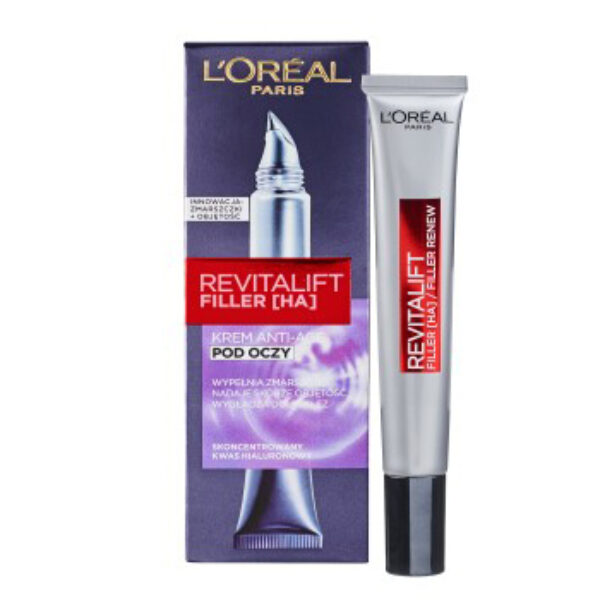 Loreal Revitalift Filler Krem pod Oczy Revitalift Filler to produkt anti-age pod oczy.Przeciwzmaszczkowe właściwości skutecznie wypełniają drobne zmarszczki.Produkt redukuje opuchliznę i cienie pod oczami.Skutecznie wygładza dolinę łez oraz nadaje skórze objętości. Skóra staje się jędrna, gładsza i napięta.Kosmetyk zawiera w swoim składzie między innymi skoncentrowany kwas hialuronowy.Produkt dedykowany jest skórze dojrzałej. Pojemność: 15 ml