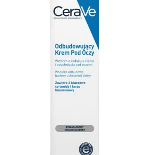 CeraVe Odbudowujący Krem pod Oczy 14mlKrem pod oczy o właściwościach odbudowujących. Kosmetyk wyraźnie redukuje widoczność cieni pod oczami, niweluje opuchliznę. Wspiera odbudowę bariery ochronnej skóry. Dodatkowo, jego działanie zostało oparte o właściwości nawilżającego kwasu hialuronowego i ceramidów. Jest produktem bezzapachowym i niekomedogennym. Polecany przez dermatologów i specjalistów. Pojemność: 14ml