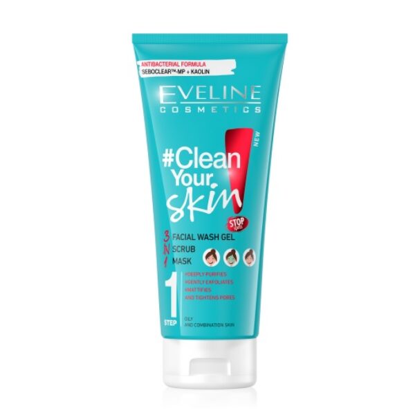 Eveline Clean Your Skin 3w1 Żel + Scrub + Maska do Twarzy 200mlŻel przeznaczony do oczyszczania skóry twarzy. Doskonale usuwa resztki makijażu oraz zanieczyszczenia i nadmiar sebum. Może być stosowany w przypadku każdego rodzaju skóry, również wrażliwej. Kosmetyk posiada w swojej formule peelingujące drobinki, dzięki czemu doskonale wygładza cerę. Produkt może być stosowany w formie żelu, scrubu oraz maski do twarzy. Żel odblokowuje pory, usuwa resztki makijażu i pozostawia skórę nawilżoną i dogłębnie oczyszczoną. Pojemność: 200ml