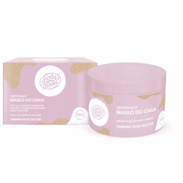 BodyBoom Ujędrniające Masło do Ciała 250mlWyjątkowa seria BodyBoom to produkty stworzone z myślą o perfekcyjnej pielęgnacji twarzy oraz ciała. Produkt z serii stworzone są na bazie wyselekcjonowanych, naturalnych składników.Posiadają nie tylko charakterystyczny, kobiecy design, ale przede wszystkim charakteryzują się wysoką skutecznością. Ujędrniające masło do ciała zawiera w swoim składzie wyciąg z wąkroty azjatyckiej, ekstrakt z korzenia żeń-szenia oraz masło kakaowe. Idealnie sprawdzi się w przypadku skóry suchej, odwodnionej, starzejącej się. Doskonale radzi sobie ze skórą pozbawioną jędrności, z cellulitem oraz rozstępami. Produkt pobudza odnowę skóry, chroni przed działaniem wolnych rodników. Posiada przyjemną konsystencję i słodki zapach. Pojemność: 250ml