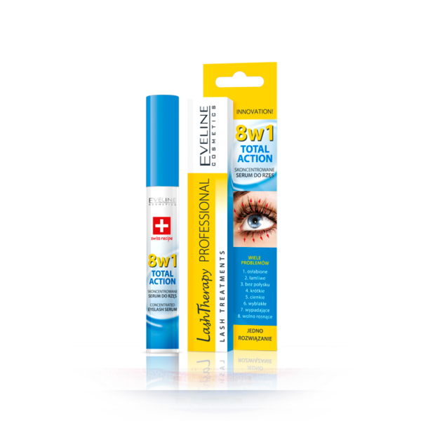 Eveline Total Action Odżywka - Serum do Rzęs 8w1:odżywka do rzęs w formie skoncentrowanego serumprodukt odbudowuje, regeneruje, wzmacnia, stymuluje wzrost, pogrubia rzęsyserum zawiera: olejek arganowy, kwas hialuronowy oraz D-phantenolodżywka jest bezpieczne dla wrażliwych oczu, testowana dermatologicznie.Pojemność: 10ml