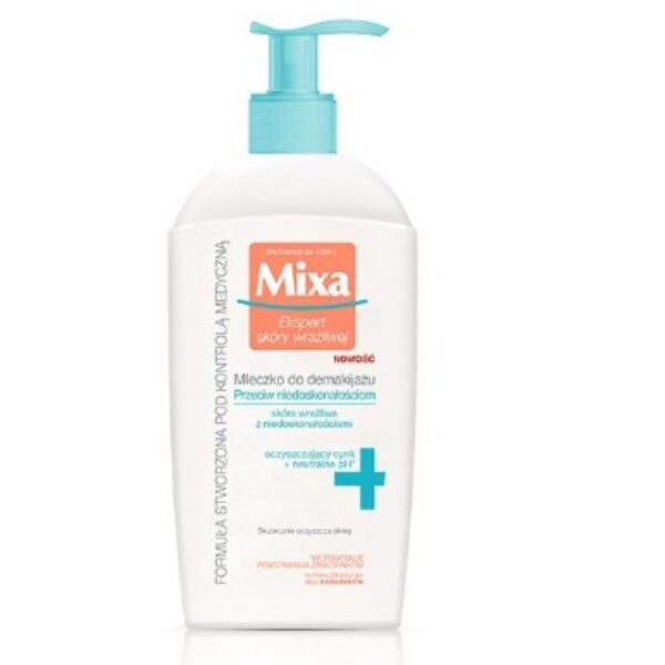 Mixa Mleczko do Demakijażu Twarzy Przeciwko Niedoskonałościom 200mlMleczko przeznaczone do demakijażu cery z niedoskonałościami. Sprawdzi się również w przypadku posiadania skóry wrażliwej, suchej. Skład produktu działa kojąco i łagodząco na skórę twarzy. Produkt delikatnie, ale skutecznie zmywa makijaż i zanieczyszczenia.Wzbogacony działaniem cynku. Formuła produktu stworzona jest pod kontrolą medyczną - w celu minimalizowania alergii.Regularne stosowanie płynu zmniejsza widoczność niedoskonałości. Nie powoduje powstawania zaskórników. Produkt zamknięty w wygodnym opakowaniu z pompką. Pojemność: 200mlPrzydatność: 6 mcy od otwarcia