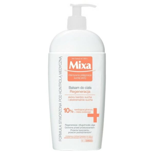 Mixa Pielęgnacja Suchej Skóry Balsam Regeneracja 400mlBalsam do ciała dedykowany skórze przesuszonej, wrażliwej, odczuwającej dyskomfort. Kosmetyk w swoim składzie posiada nawilżającą glicerynę oraz mleko owsiane. Zamknięty został w wygodnym opakowaniu z pompką. Intensywnie nawilża i regeneruje, nawet najbardziej odwodnioną i wrażliwą skórę. Jego formuła została stworzona pod kontrolą medyczną. Likwiduje oznaki suchości i dyskomfortu: szorstkość, swędzenie, uczucie ściągnięcia i zaczerwienienia. Jest produktem hipoalergicznym. Pojemność: 400ml