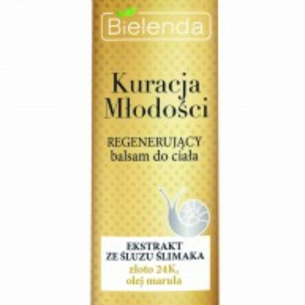 Bielenda Kuracja Młodości Regenerujący Balsam do Ciała 400ml Regenerujący balsam do ciała marki Bielenda z serii Kuracja Młodości. Zawiera drogocenny ekstrakt ze śluzu ślimaka, który gwarantuje regenerację skóry i jej nawilżenie. Kosmetyk wzbogacony został olejem z opuncji figowej, który spowalnia starzenie się skóry. Dodatkowo, w jego składzie znaleźć można: kwas glikolowy, alantoinę, proteiny, kolagen i elastynę, a także witaminy: A, C oraz E.Jest wydajny, szybko się wchłania i nie pozostawia tłustego filmu na skórze. Charakteryzuje się wyjątkową konsystencją i delikatnym zapachem. Balsam zamknięty został w eleganckim opakowaniu z pompką. Pojemność: 400ml