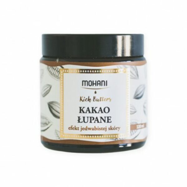 Mohani Rich Butters Masło do Ciała Kakao Łupane 100gMasło stworzone z myślą o skórze wymagającej, szorstkiej, suchej.Sprawdzi się w przypadku posiadania cery dojrzałej.Kosmetyk doskonale zmiękcza naskórek i natłuszcza.Masło zwiększa elastyczność skóry, ujędrnia ją i napina.Całość zamknięta w eleganckim słoiczku.Produkt posiada konsystencję twardego surowca. Przed użyciem należy trzymać go w ciepłym miejscu lub ogrzać w kąpieli wodnej.Pojemność: 100g
