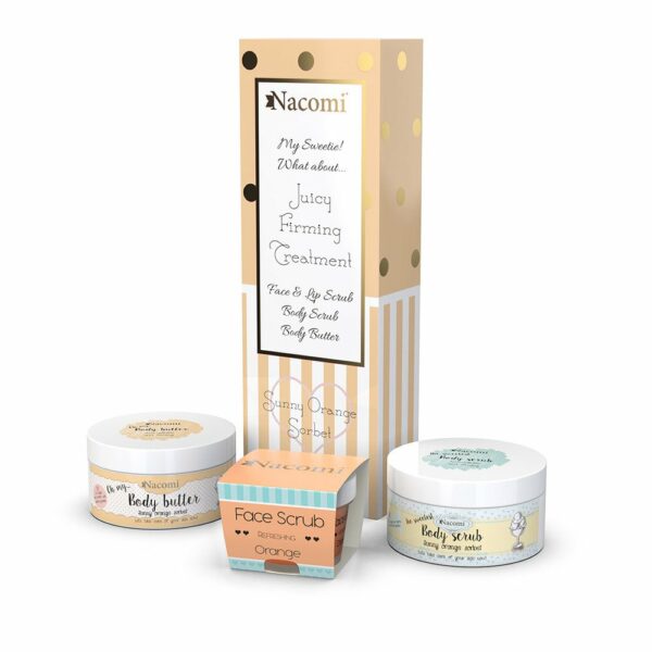 Nacomi Zestaw Pielęgnacyjny Pomarańczowy Sorbet Zestaw zawiera następujące produkty:Peeling do Twarzy i Ust Pomarańcza 80g:Peeling przeznaczony do pielęgnacji skóry twarzy i ust.Produkt wykazuje silne właściwości odżywcze. Złuszcza martwy naskórek i wygładza skórę. W formule peelingu znajdziemy olej jojoba, olej ze słodkich migdałów, olej z pestek winogron.Peeling podczas stosowania zmienia swoją formułę z żelowej na kremową.Peeling Cukrowy Pomarańczowy 125g:Produkt przeznaczony do każdego rodzaju skóry. Peeling ujędrnia i wygładza skórę.Doskonały w walce z cellulitem. Posiada piękny zapach pomarańczy.Masło do Ciała Pomarańczowy Sorbet 100ml:Naturalne masło shea z dodatkiem oleju macadamia.Produkt zawiera witaminę E oraz olejki eteryczne z pomarańczy.Masło wspaniale ujędrnia skórę i działa antycellulitowo.Produkt posiada piękny pomarańczowy zapach.Pomaga w walce z rozstępami, usprawnia metabolizmProdukt intensywnie nawilża i wygładza skórę.Całość zapakowana w ozdobne opakowanie.Zestaw jest idealnym pomysłem na prezent dla bliskiej osoby.