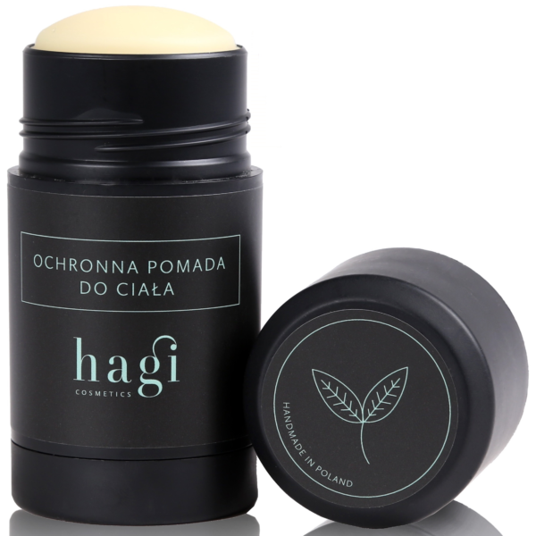 Hagi Ochronna Pomada do Ciała z Olejem Monoi Balsam do ciała w postaci sztyftu, o odświeżającej nucie zapachowej mięty i kwiatów Gardenii Tahitańskiej.Przeznaczony do pielęgnacji skóry suchej i dojrzałej.Zawiera masło mango i shea, wosk pszczeli i candelilla, olej monoi i z pestek moreli, oraz olejek eteryczny pozyskany z mięty kędzierzawej.Produkt nawilża, odżywia i pielęgnuje nawet najbardziej przesuszone partie ciała (dłonie, łokcie, kolana, pięty).Pojemność: 65g