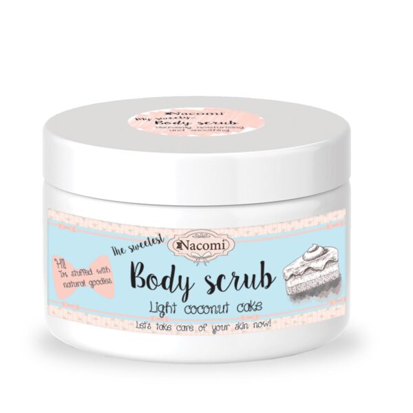 Nacomi Peeling do Ciała Lekki Kokosowy Tort 180ml:produkt przeznaczony do każdego rodzaju skóryprodukt na bazie cukru złuszcza naskórekdzięki zawartości oleju kokosowego i oleju ze słodkich migdałów, doskonale nawilża skórę, odżywia ją i ujędrniapeeling zawiera wiórki kokosoweStosowanie: Niewielką ilość produktu nałóż na wilgotną skórę. Masuj kolistymi ruchami, a następnie spłucz. Pojemność: 180ml