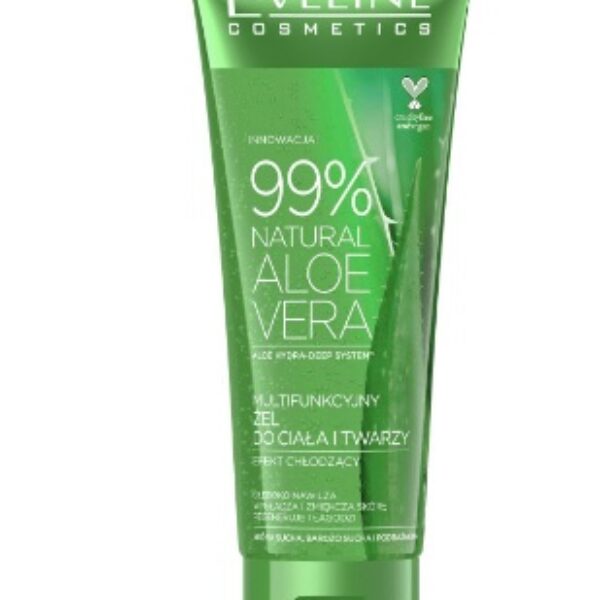 Eveline Body Żel Multifunkcyjny 99% Aloe Vera 250mlMultifunkcyjny żel do ciała i twarzy. Zawiera 99% naturalnego aloesu. Wpływa na poziom nawilżenia skóry, koi i łagodzi podrażnienia. Jest kosmetykiem multifunkcyjnym, może być używany zarówno do twarzy, jak i całego ciała. Z powodzeniem zastępuje balsam, krem do twarzy, serum, maskę na noc. Sprawdzi się w przypadku każdego rodzaju skóry. Zawiera niezbędne dla skóry witaminy, między innymi: A, C oraz E. Bogaty w aminokwasy. Pojemność: 250ml