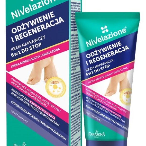 Farmona NIVELAZIONE Krem Naprawczy do Stóp 6w1Krem przeznaczony do pielęgnacji bardzo suchej i zniszczonej skóry stóp.Produkt zawiera parafinę, masło shea, wosk pszczeli, deodronalny bloker zapachu.Krem chroni stopy przed poceniem się i powstawaniem przykrego zapachu.Stosowanie kremy wpływa na odpowiedni stopień nawilżenia skóry.Produkt pozostawia stopy gładkie, miękkie, zregenerowane.Pojemność: 75mlSposób użycia: Krem delikatnie wmasuj w czystą i osuszoną skórę stóp.Stosuj codziennie, rano i wieczorem.