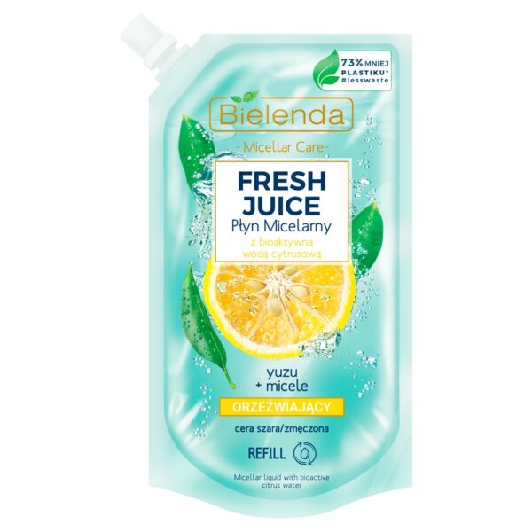 Bielenda Fresh Juice Uzupełnienie Płyn Micelarny Orzeźwiający 500mlPłyn micelarny z serii kosmetyków Fresh Juice. Kosmetyk zawiera bioaktywną wodę cytrusową (odpowiada za działanie antyoksydacyjne), ekstrakt z yuzu oraz micele. Dedykowany jest cerze szarej oraz zmęczonej. Płyn przeznaczony jest do codziennego oczyszczania i pielęgnacji cery. Pojemność: 500mlWersja: uzupełnienie