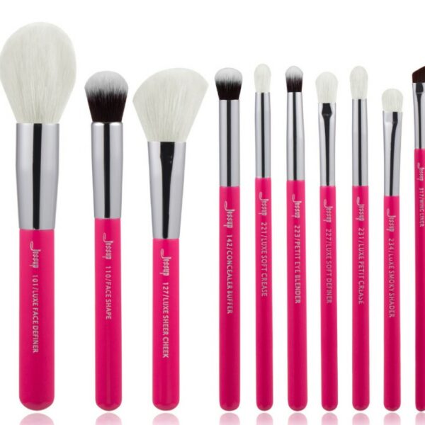 Jessup Zestaw 10 Pędzli do Makijażu T203 Rose Carmin/Silver Zestaw pędzli sprawdzi się w wykonywaniu makijażu twarzy i oczu. Pędzle posiadają dwukolorowe, syntetyczne, miękkie i delikatne włosie.Pomalowane na różowo drewniane trzonki idealnie komponują się ze skuwkami w odcieniu srebra.W zestawie znajdziemy następujące pędzle:1. Pędzel Jessup Wing Liner2. Pędzel Jessup Luxe Smoky Shader3. Pędzel Jessup Luxe Petit Crease4. Pędzel Jessup Luxe Soft Definer5. Pędzel Jessup Petit Eye Blender6. Pędzel Jessup Luxe Soft Crease7. Pędzel Jessup Concealre Buffer8. Pędzel Jessup Luxe Sheer Cheek9. Pędzel Jessup Face Shape10. Pędzel Jessup Luxe Face Definer Zestaw będzie wspaniałą ozdobą toaletki i świetnym pomysłem na prezent!