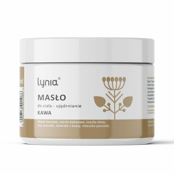 Lynia Masło do Ciała Ujędrnianie Kawa 150mlMasło do ciała o właściwościach ujędrniających marki Lynia. Produkt stworzony został na bazie naturalnych składników - między innymi masła kawowego. Wzbogacony działaniem oleju z awokado, masłem shea. Zawartość mleczka pszczelego sprawia, że produkt opóźnia proces starzenia się skóry i działa antyoksydacyjnie. Może być stosowany w przypadku każdego rodzaju skóry. Doskonale uzupełnia codzienną pielęgnację ciała. Pojemność: 150ml