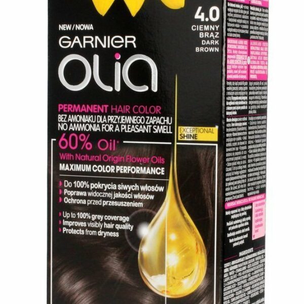 Garnier Olia Farba do Włosów 4.0 Ciemny BrązFarba do włosów z serii Olia marki Garnier. Pokrywa w 100% wszystkie włosy, a dodatkowo - wpływa na ich kondycję. W swoim składzie zawiera pielęgnacyjne olejki, które nie przesuszają włosów. Skoncentrowana formuła zapewnia trwały, równomierny i intensywny efekt. Włosy stają się gładkie i miękkie w dotyku. Farba posiada delikatnie kwiatowy zapach. Dostępna w wielu wersjach kolorystycznych. Odcień: 4.0 Ciemny Brąz