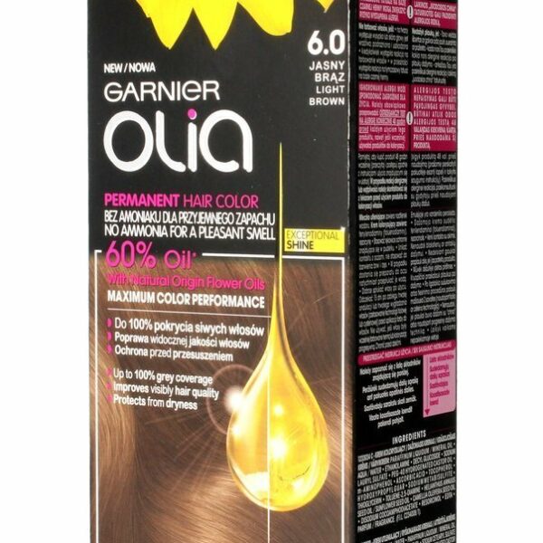 Garnier Olia Farba do Włosów 6.0 Jasny BrązFarba do włosów z serii Olia marki Garnier. Pokrywa w 100% wszystkie włosy, a dodatkowo - wpływa na ich kondycję. W swoim składzie zawiera pielęgnacyjne olejki, które nie przesuszają włosów. Skoncentrowana formuła zapewnia trwały, równomierny i intensywny efekt. Włosy stają się gładkie i miękkie w dotyku. Farba posiada delikatnie kwiatowy zapach. Dostępna w wielu wersjach kolorystycznych. Odcień: 6.0 Jasny Brąz